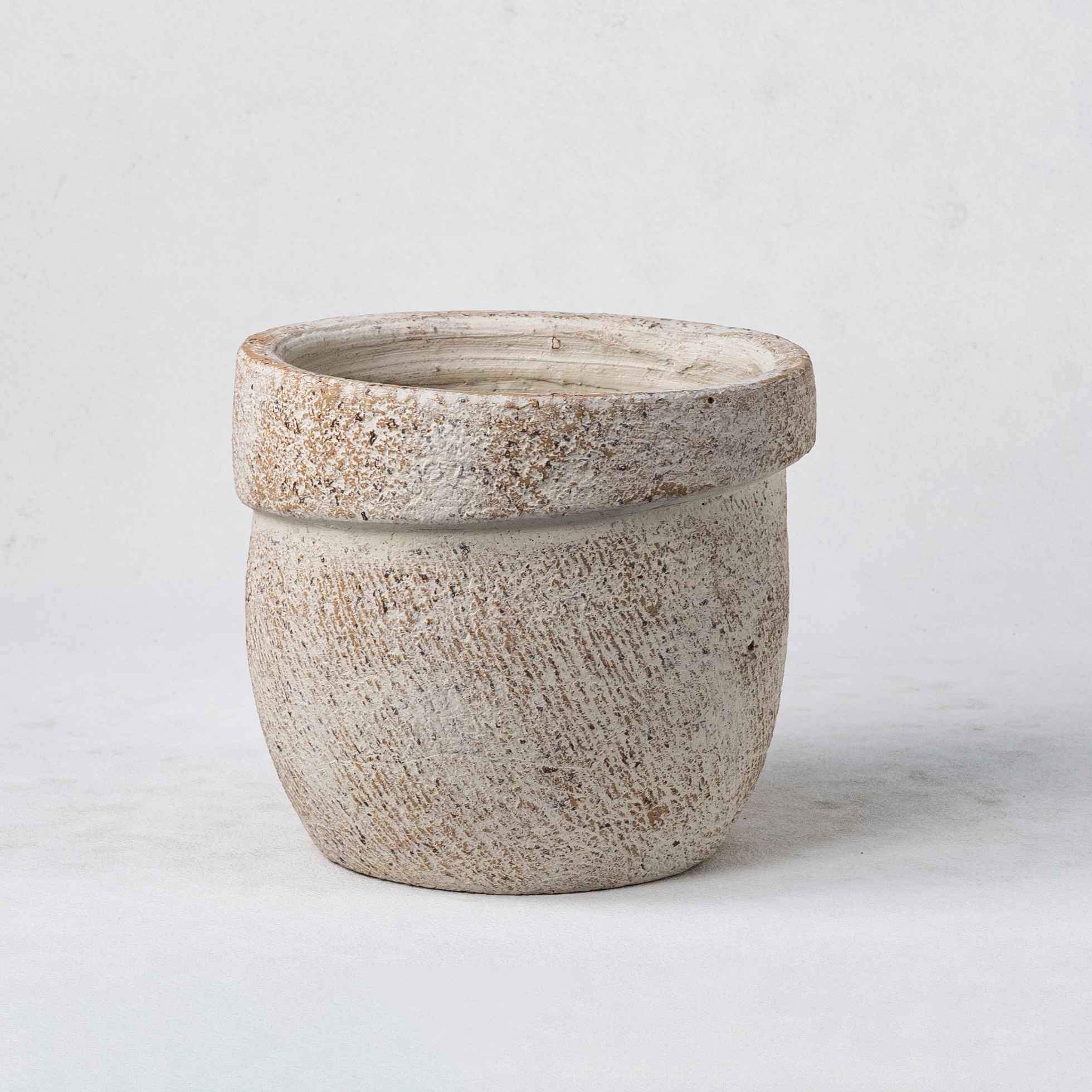 - الزنجار الطبيعي وتأثير الشيخوخة: تتميز أحواض الزرع بلون رمادي فاتح وأبيض مائل للأبيض الفاتح وقاعدة رمادية مائلة للأبيض، مع بقع عشوائية من اللون البني الفاتح والبرتقالي المائل للبني، مما يحاكي المظهر القديم للأشياء البالية التي عفا عليها الزمن. وتكشف بعض المناطق عن لون الطين الطبيعي، مما يحافظ على الملمس الخام للتراكوتا بينما يعكس "المظهر العتيق".