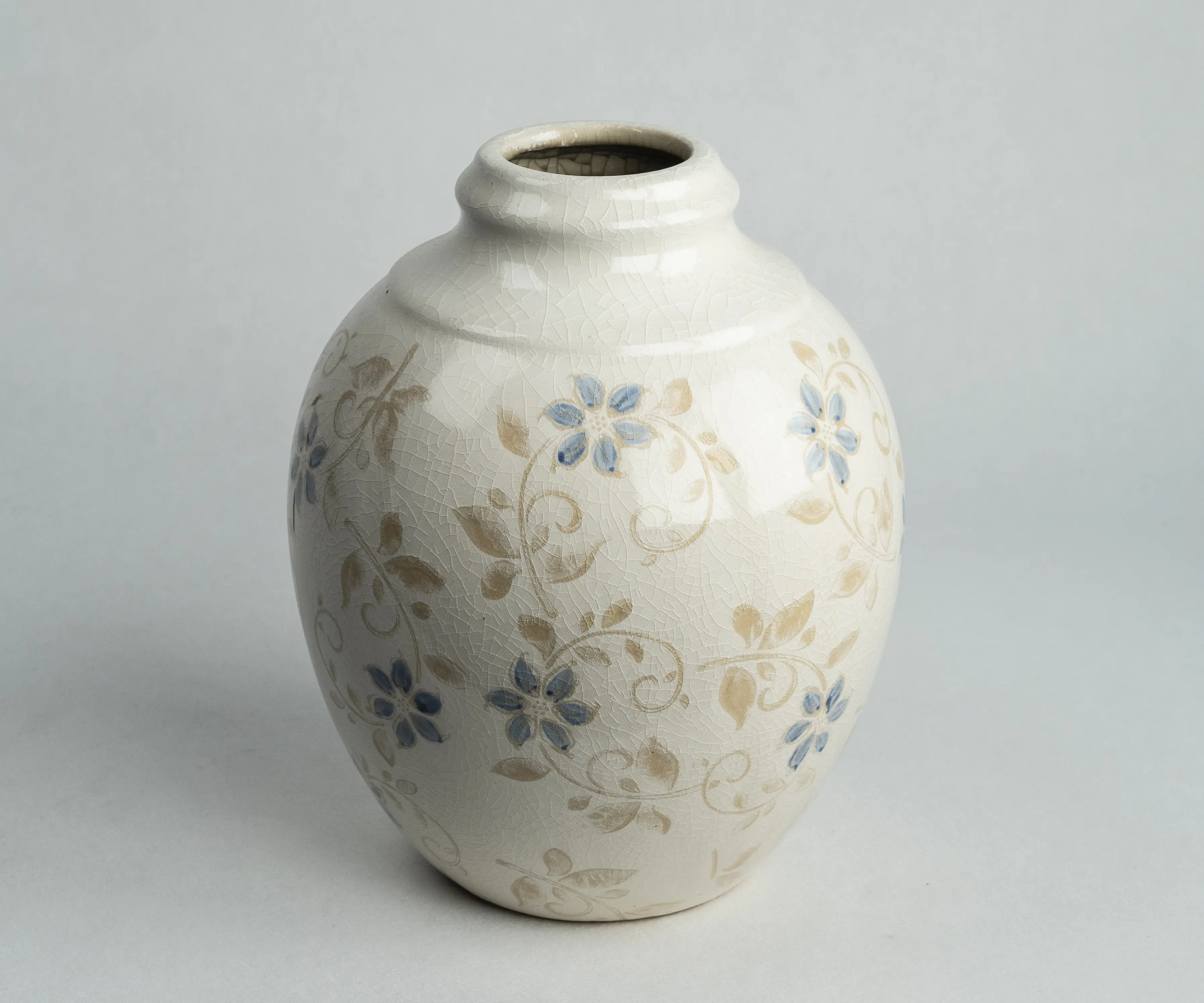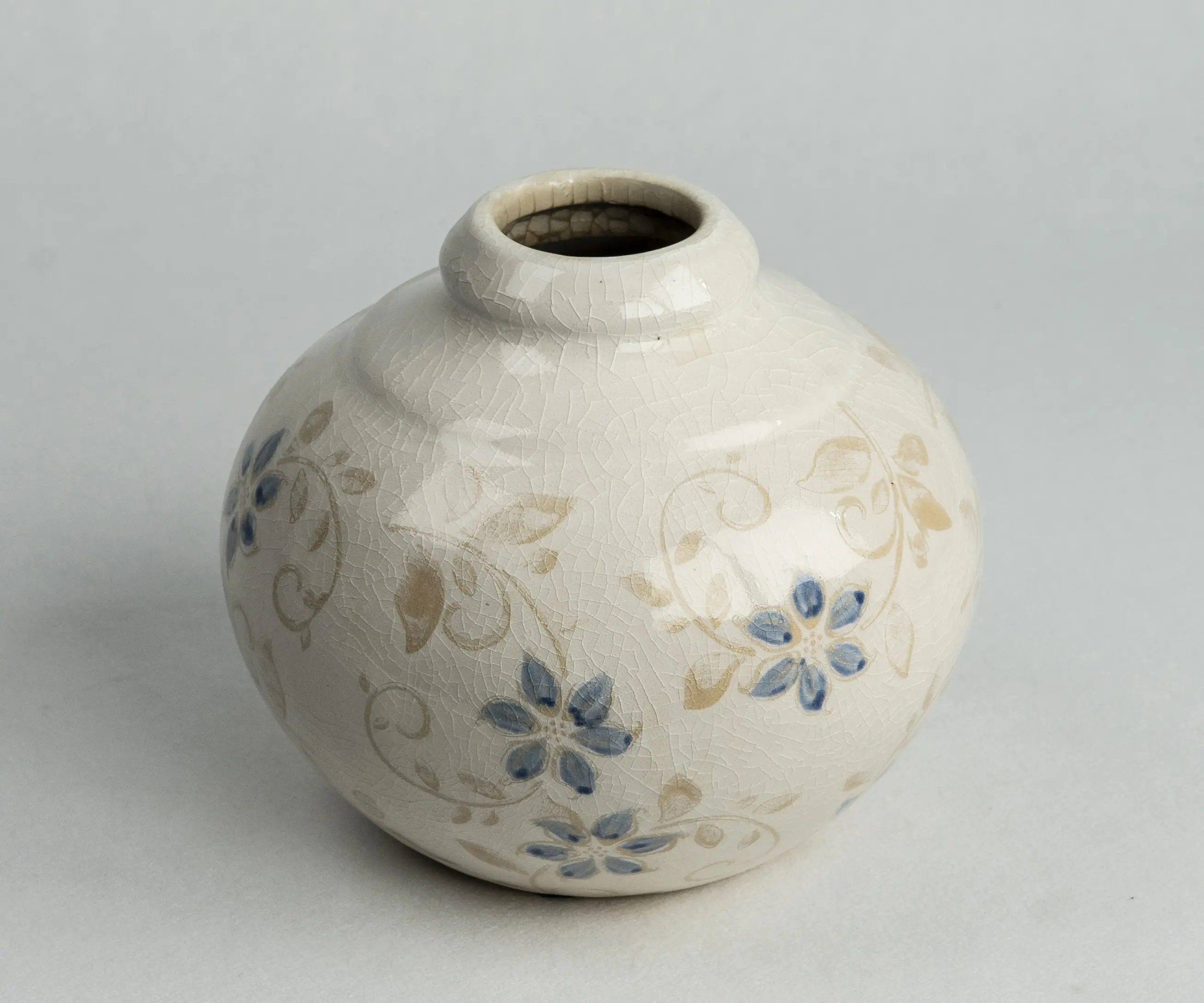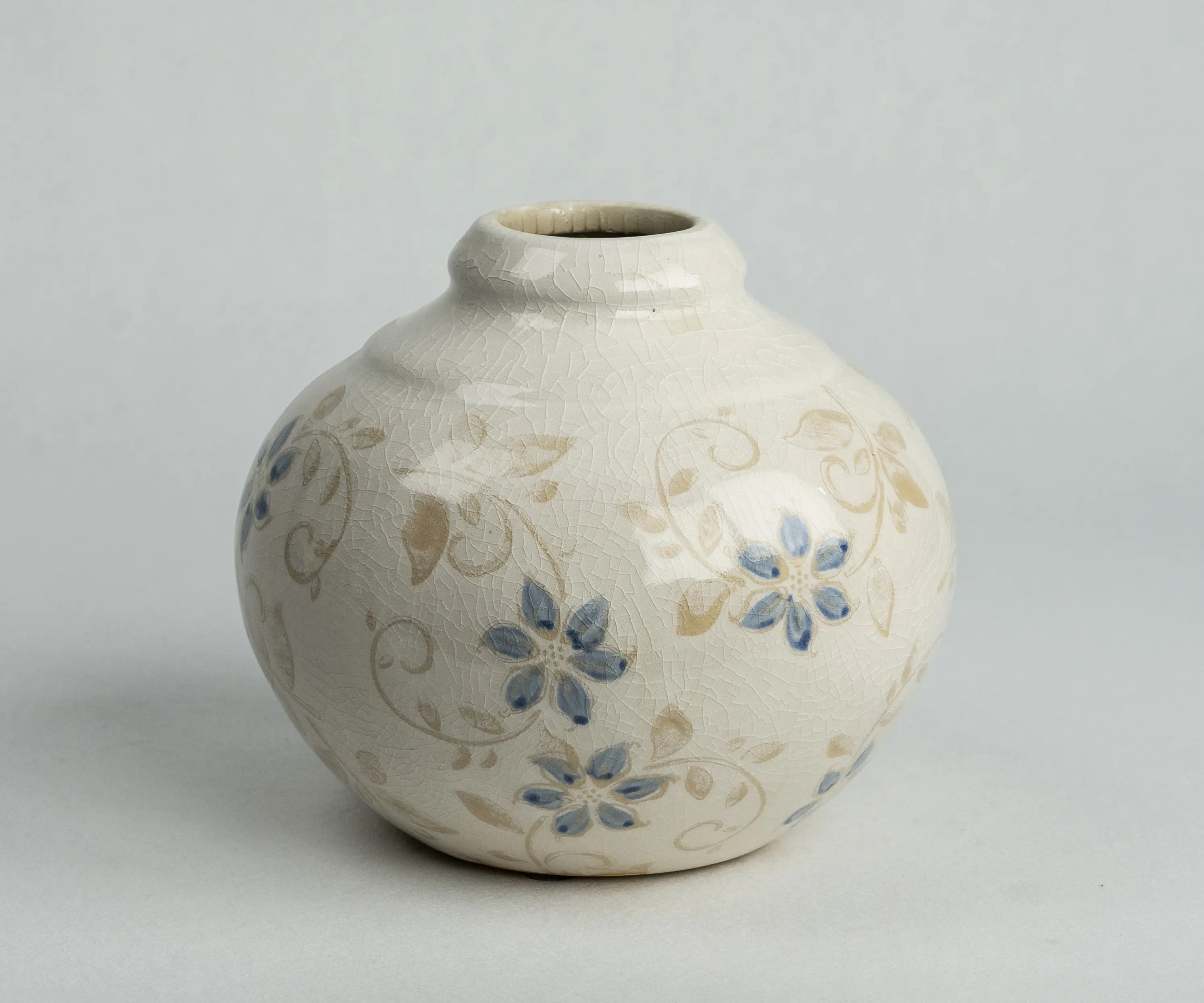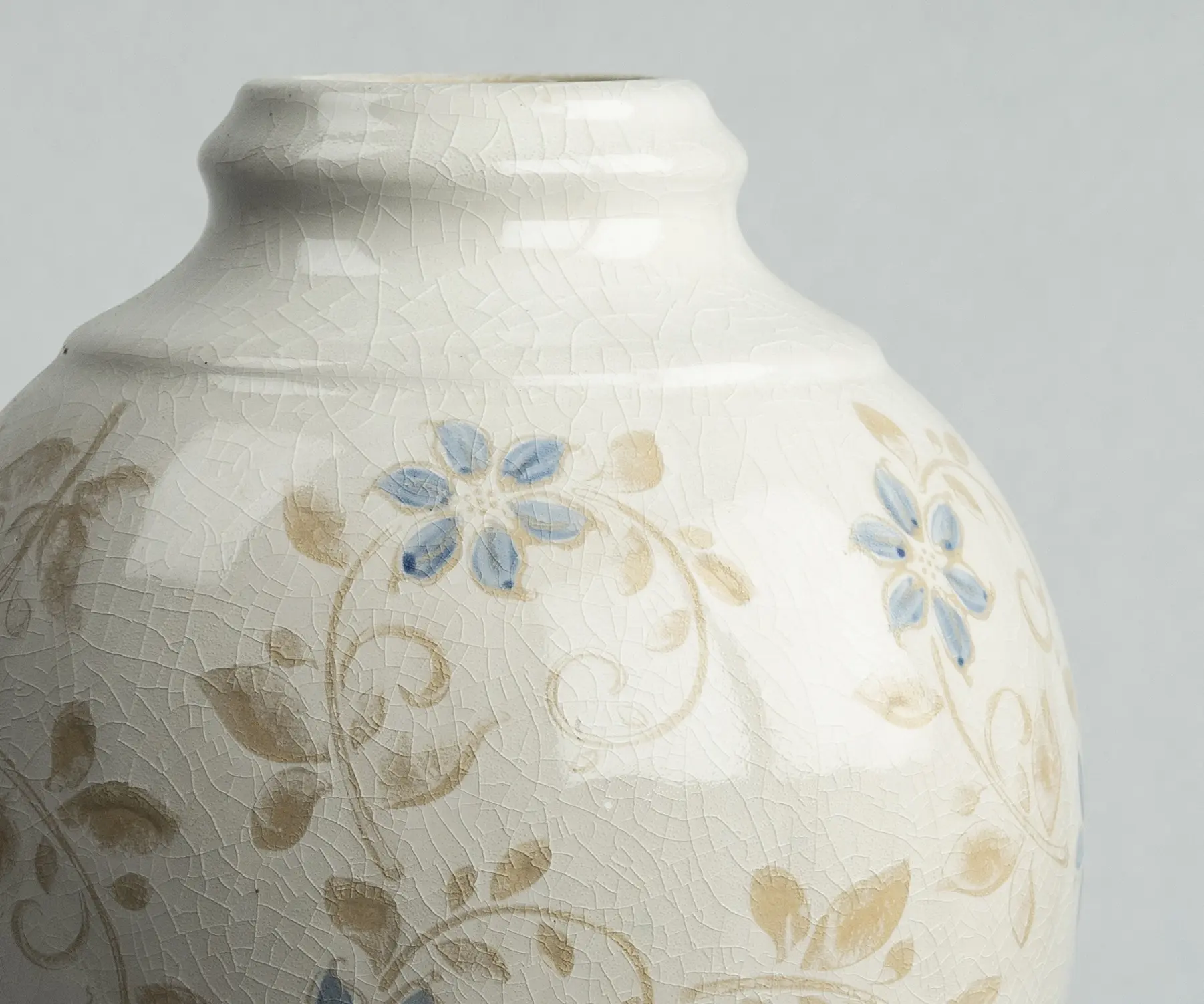 These wholesale handcrafted Keramik-Vasen feature a classic spherical silhouette with a refined, narrow neck, a delicate crackle glaze, and hand-painted floral and vine motifs that blend traditional elegance with modern natural aesthetics. Designed for home décor brands, hotel suppliers, florists, and gift wholesalers, it offers both visual sophistication and reliable durability for large-scale decoration and retail needs.