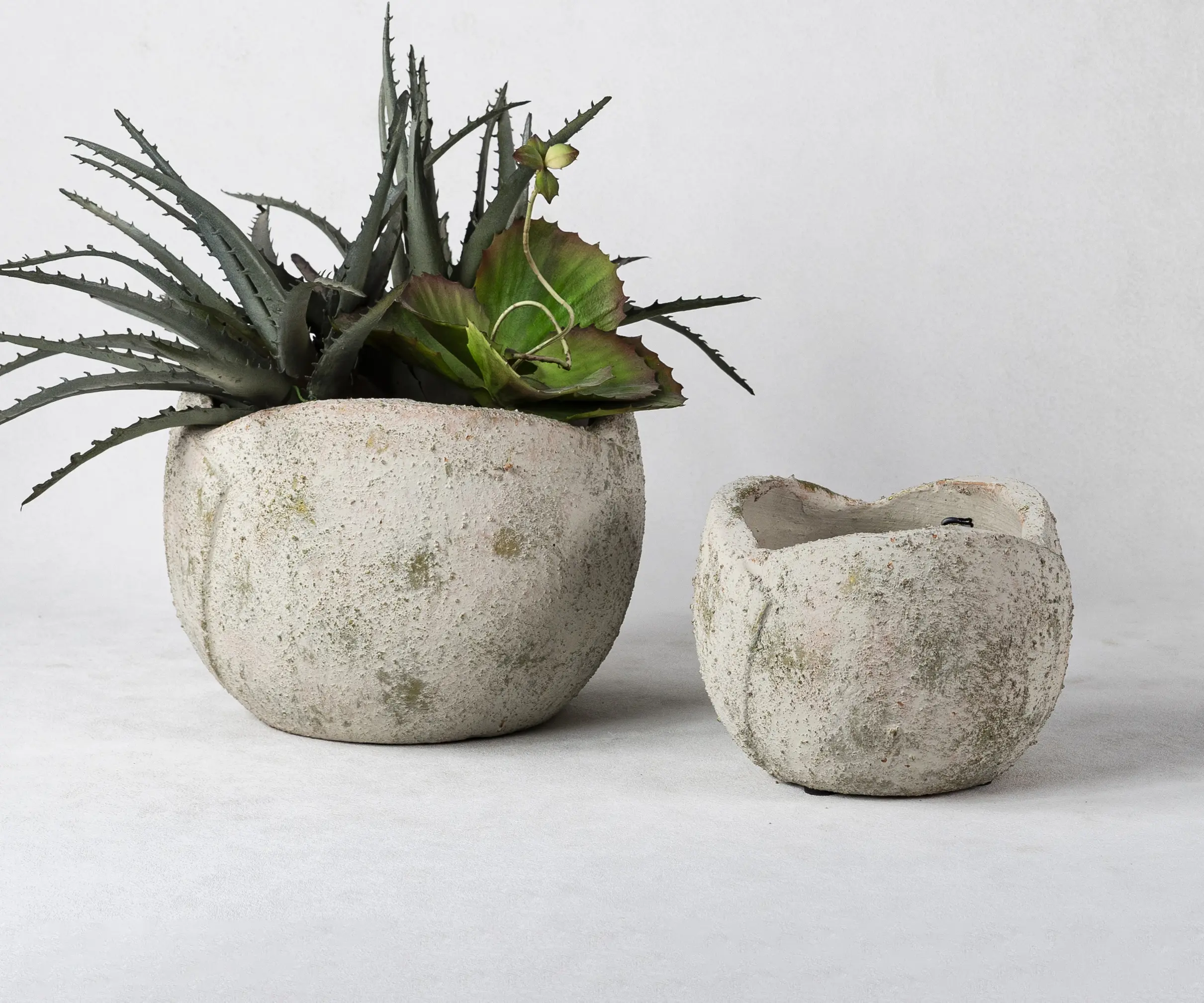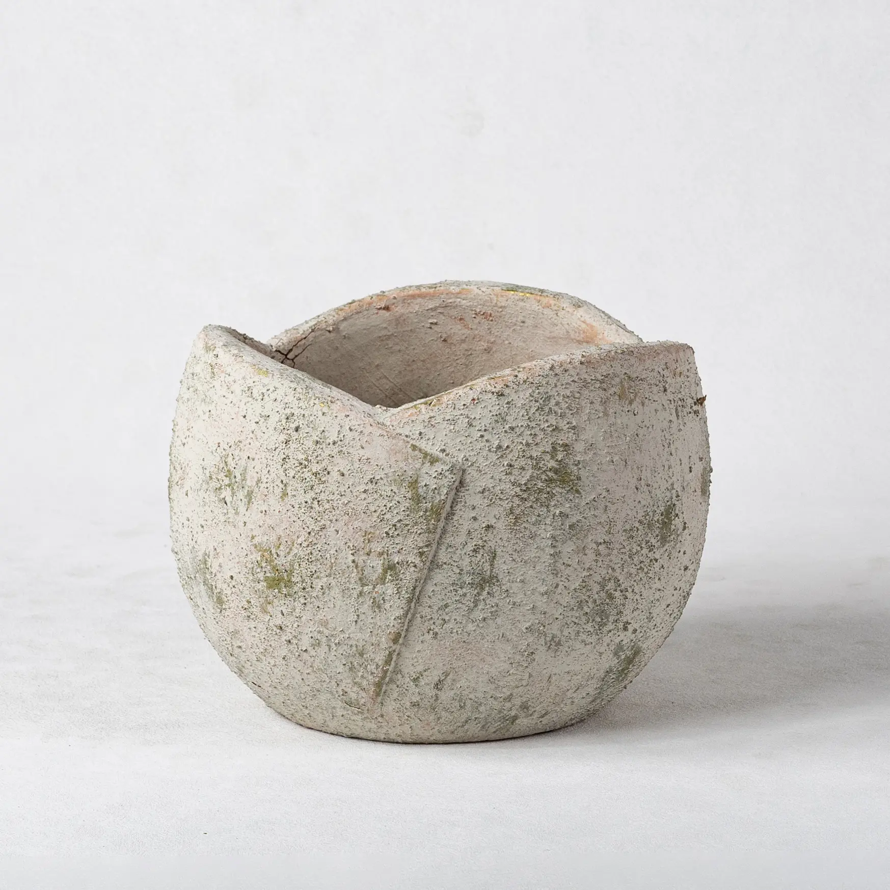 This bulk ceramic planter is designed with natural rough textures, irregular cracks, and moss-like stains to recreate the beauty of timeworn surfaces. Available in a variety of rounded and wide forms. Vintage, wabi-sabi-inspired style of these bulk ceramic planters makes them ideal for B2B clients such as home décor brands, flower studios, lifestyle stores, and boutique hotels.