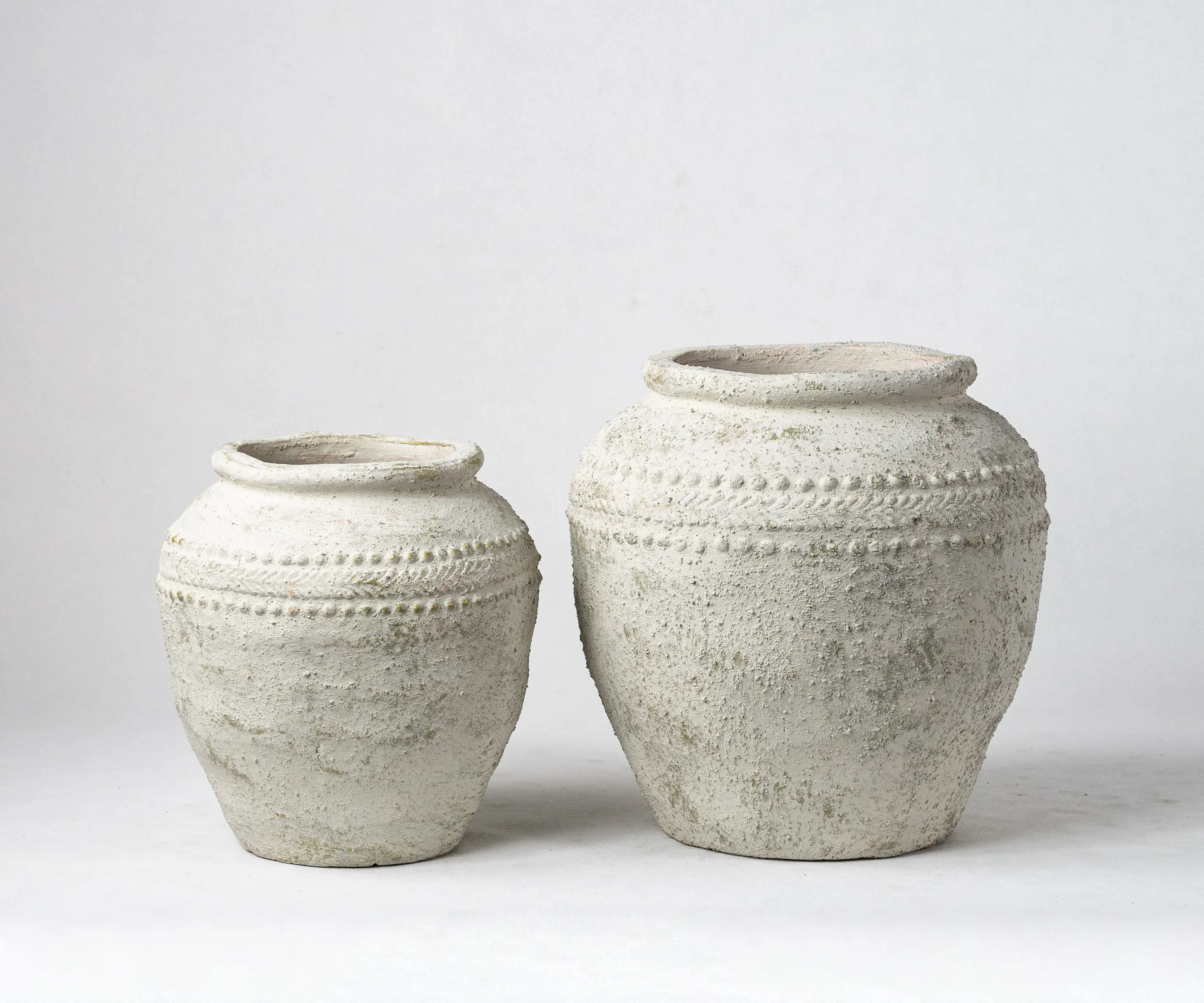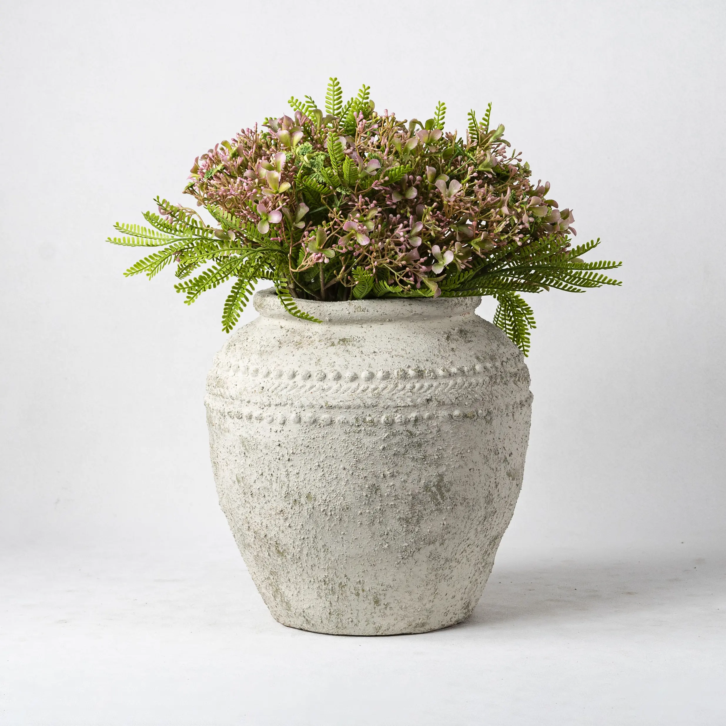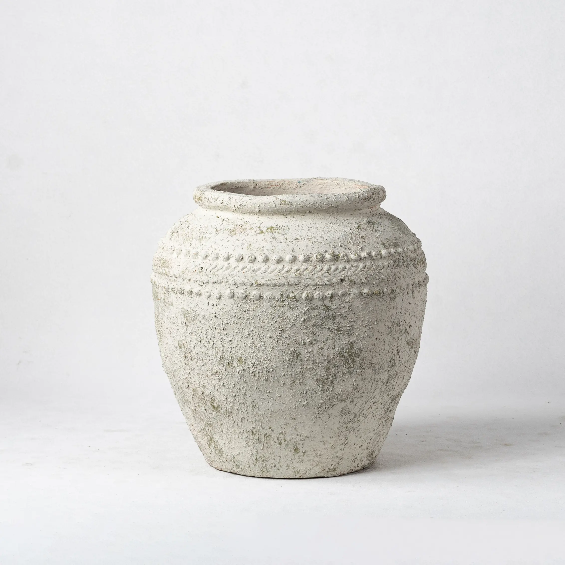 Wholesale outdoor planters of our supply are crafted from natural clay with a rustic, grainy texture. These ceramic jars and jars feature hand-applied aging techniques with moss-like stains, weathered details, and embossed patterns. Available in multiple shapes and sizes. Their vintage and wabi-sabi aesthetic make them ideal for B2B buyers such as home décor brands, flower studios, lifestyle stores, and boutique hotels.
