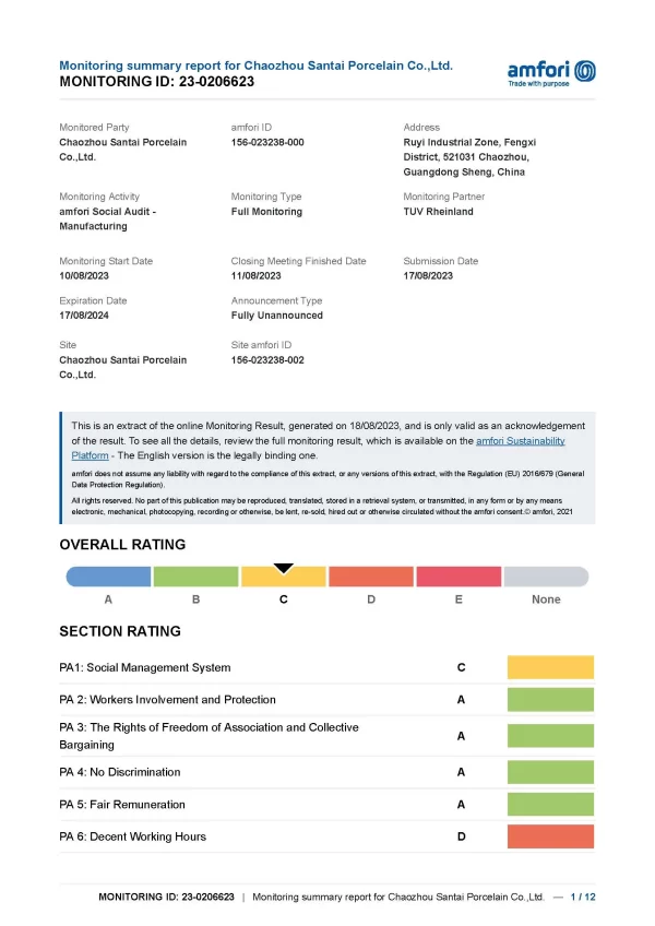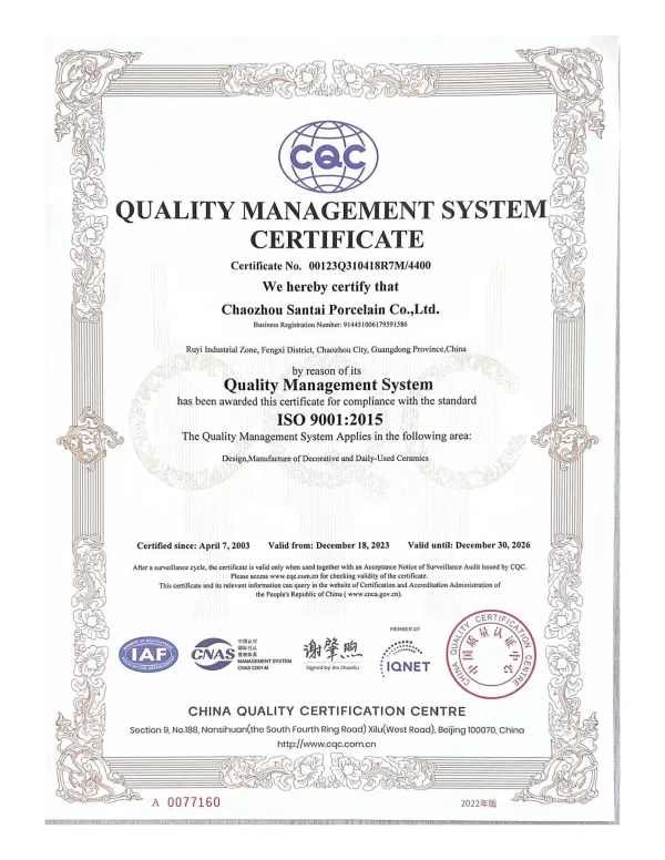SANTAIは、プロフェッショナルな職人技を通じて、お客様に高品質の陶器を提供することをお約束します。製品の品質を重視し、持続可能な発展に常に注意を払っています。当社はISO 9001、ISO 14001、ISO 45001、BSCI認証を取得し、生産工程で国際基準を満たし、環境への影響を低減し、グリーン製造を推進しています。
