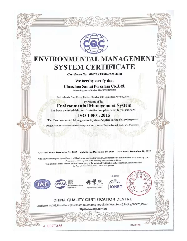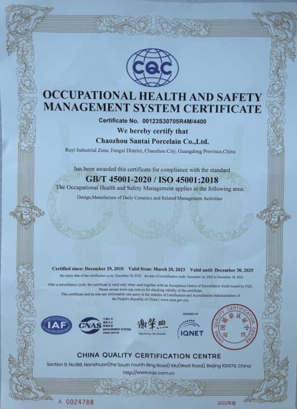 三泰致力于通过专业的工艺为客户提供高品质的陶器。我们重视产品质量,始终关注可持续发展。公司已获得 ISO 9001、ISO 14001、ISO 45001、BSCI 认证,确保在生产过程中符合国际标准,减少对环境的影响,促进绿色制造。